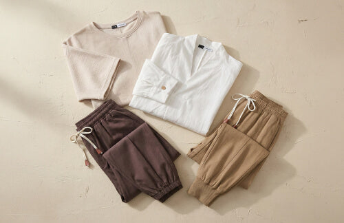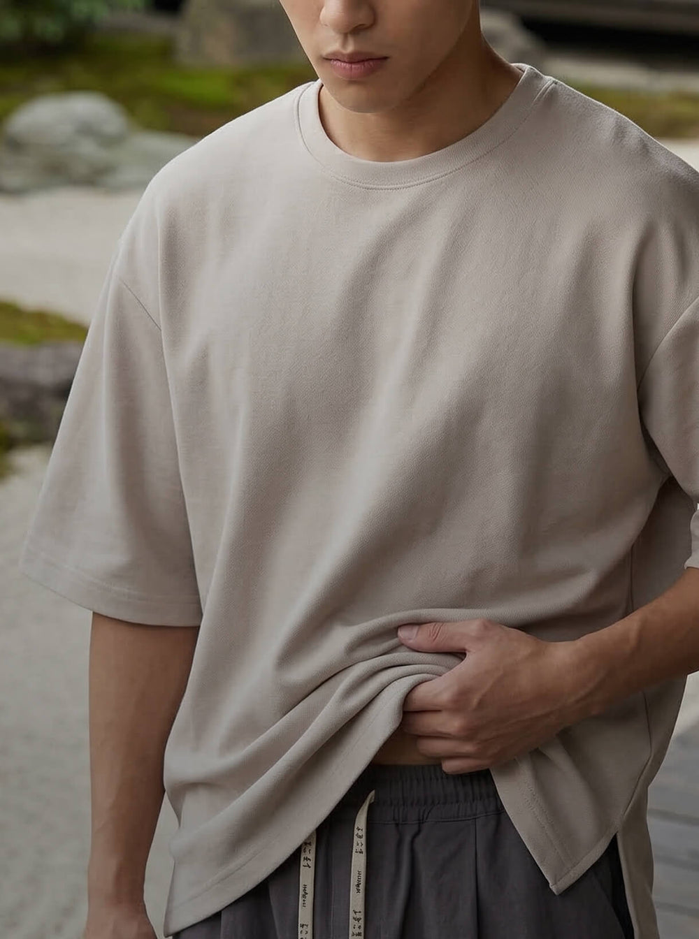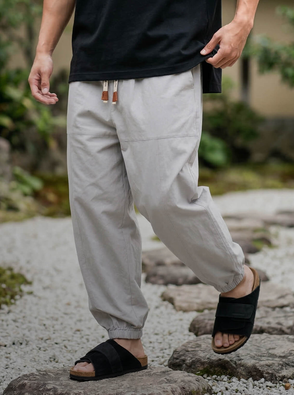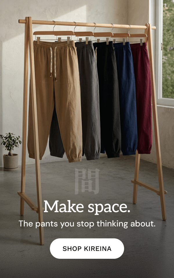 100% premium cotton broadcloth with a refined feel. Pleated front. Elastic cuffs. Roomy hip pockets that actually fit your phone. Finished with engraved brown faux leather aglets and drawstrings stamped with 水に流す (Mizu ni Nagasu), meaning "let it flow."
