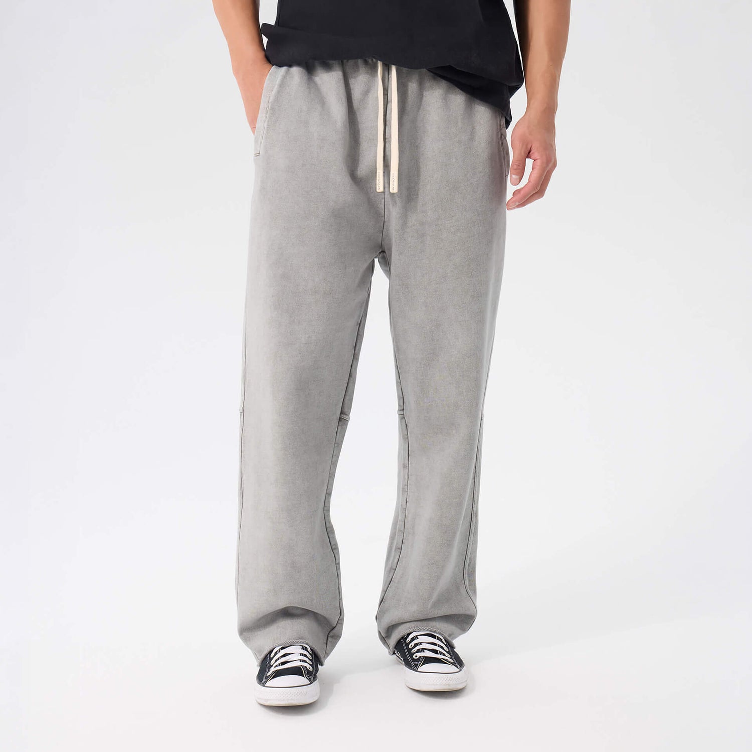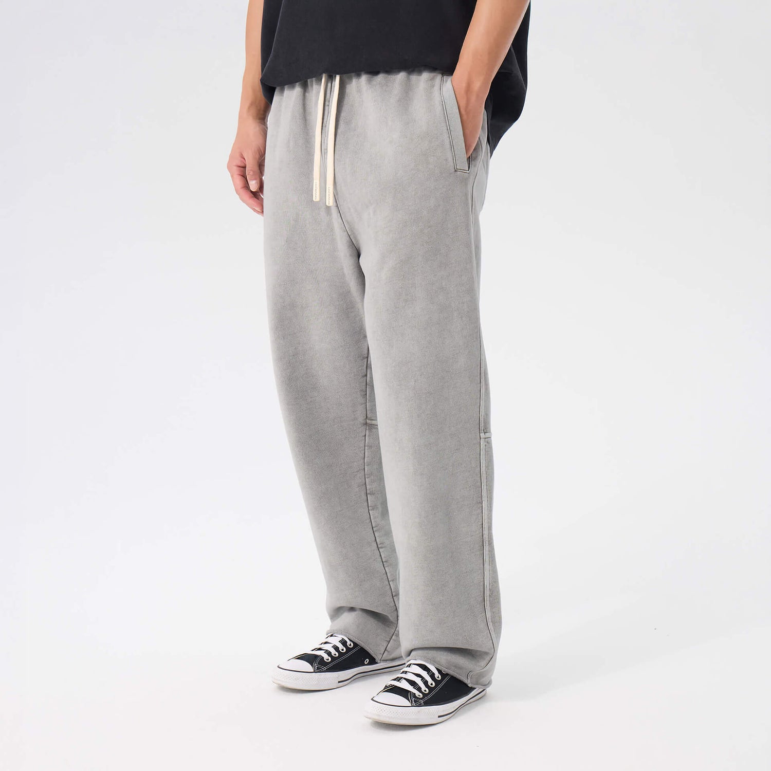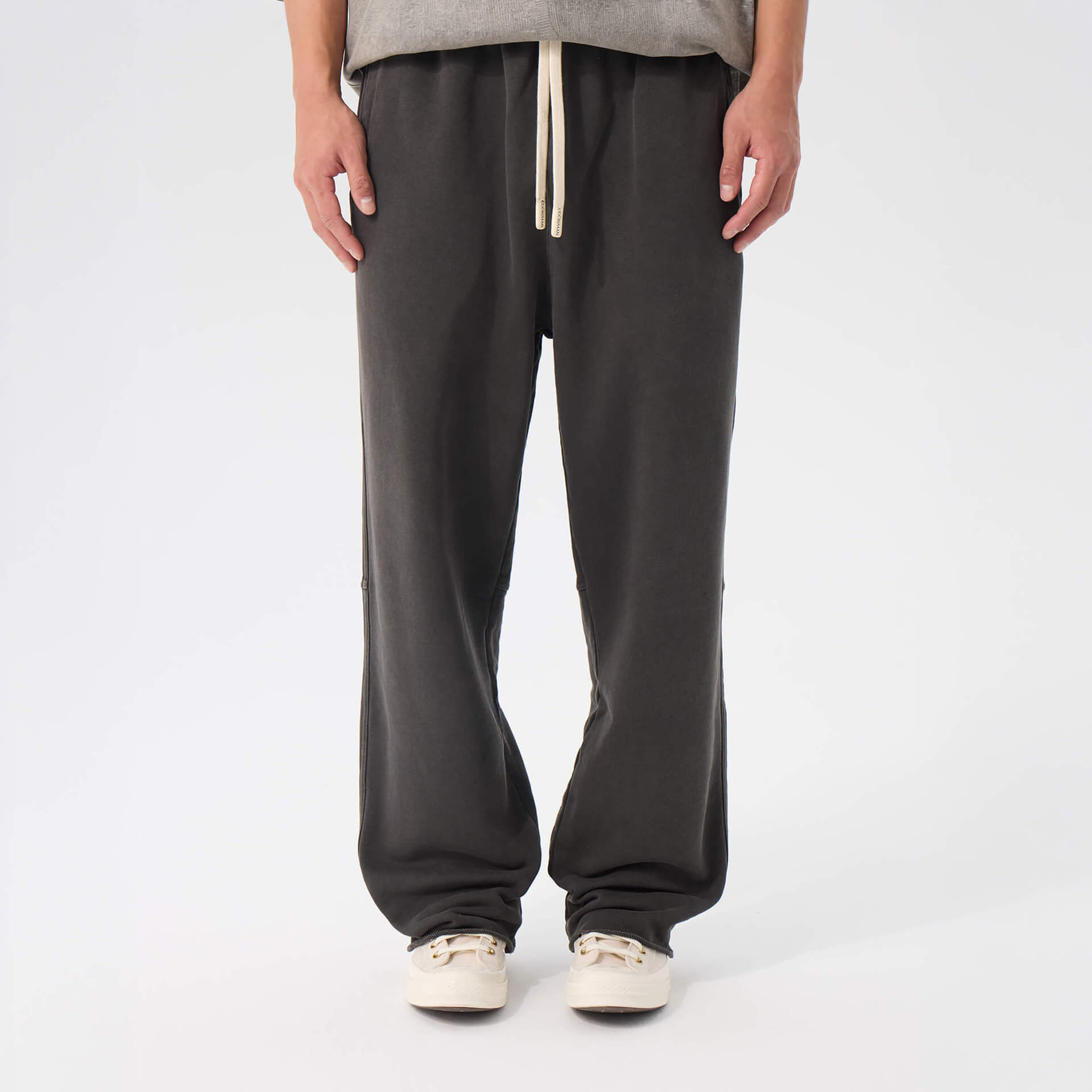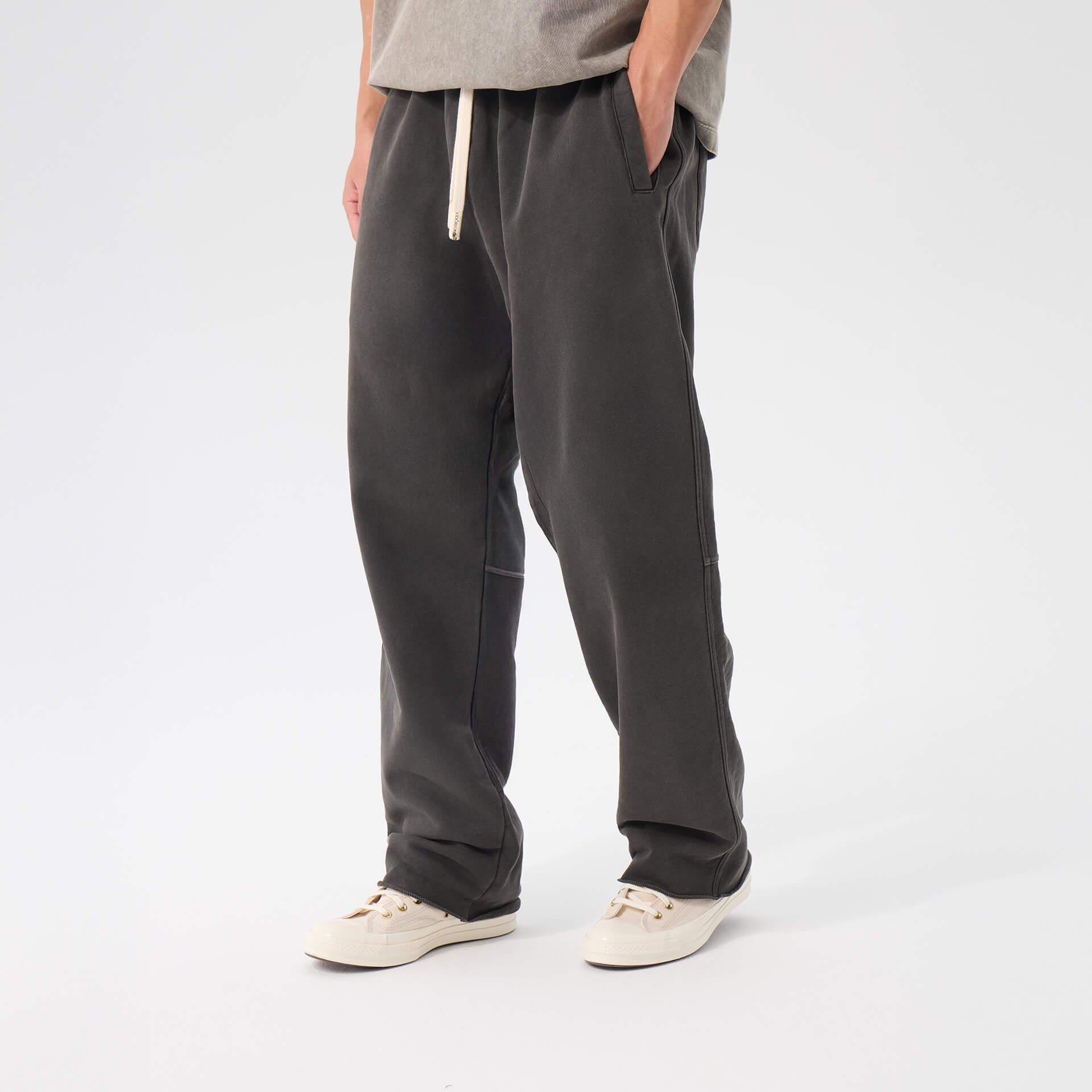 Heavyweight washed cotton. Loose through the body, mid-rise, extra long. Raw edge hems, adjustable drawstring waist. The kind of drape that looks intentional without trying.