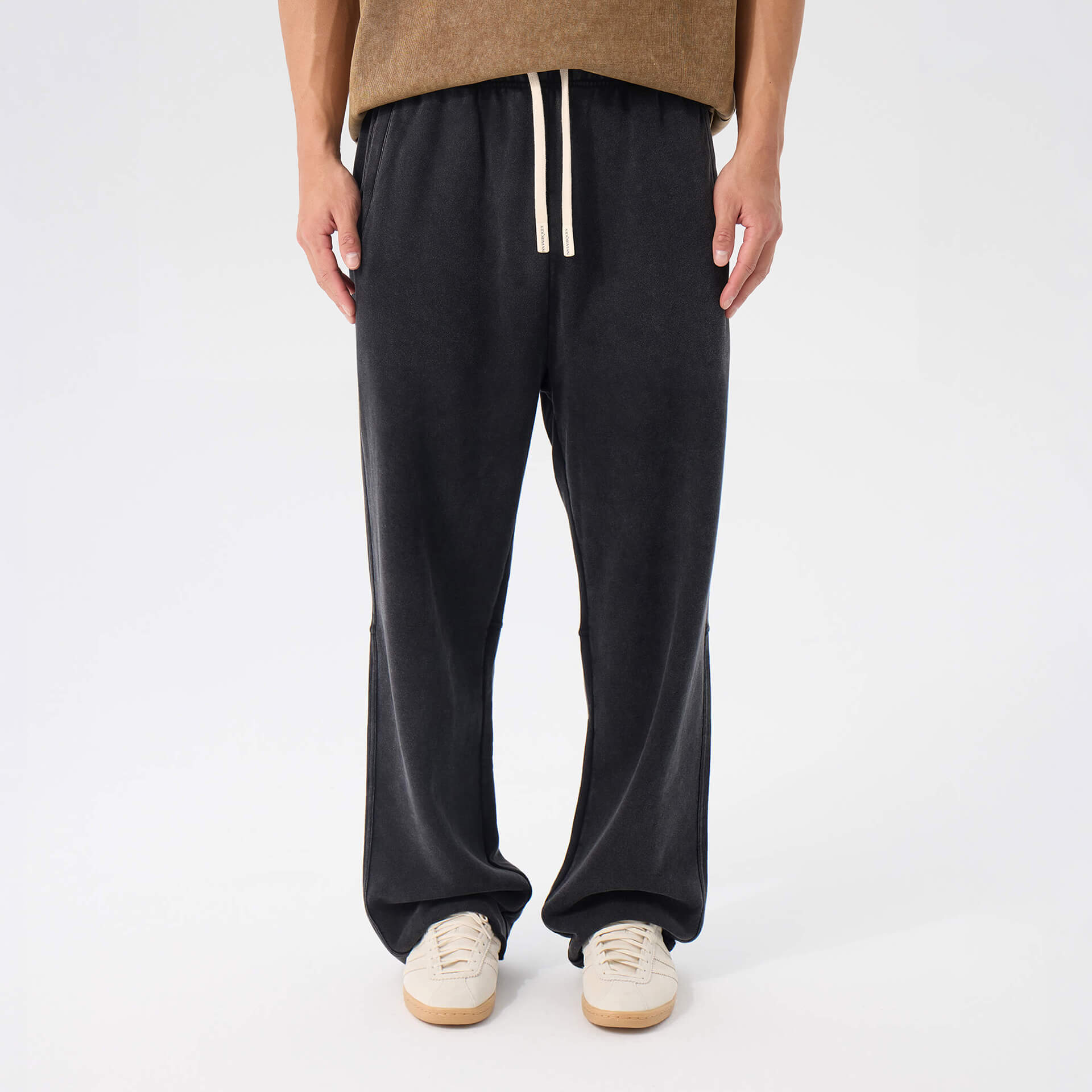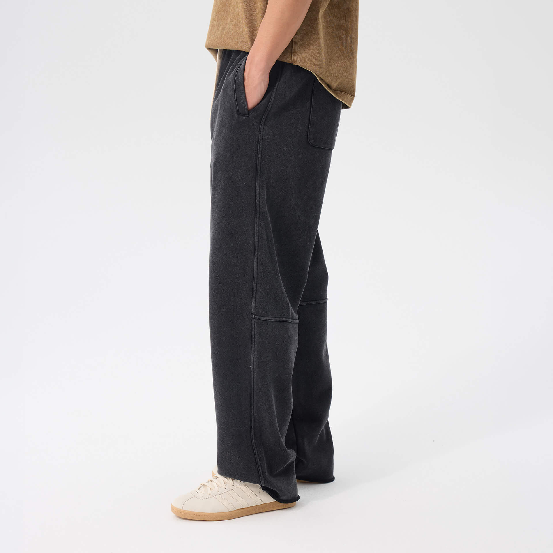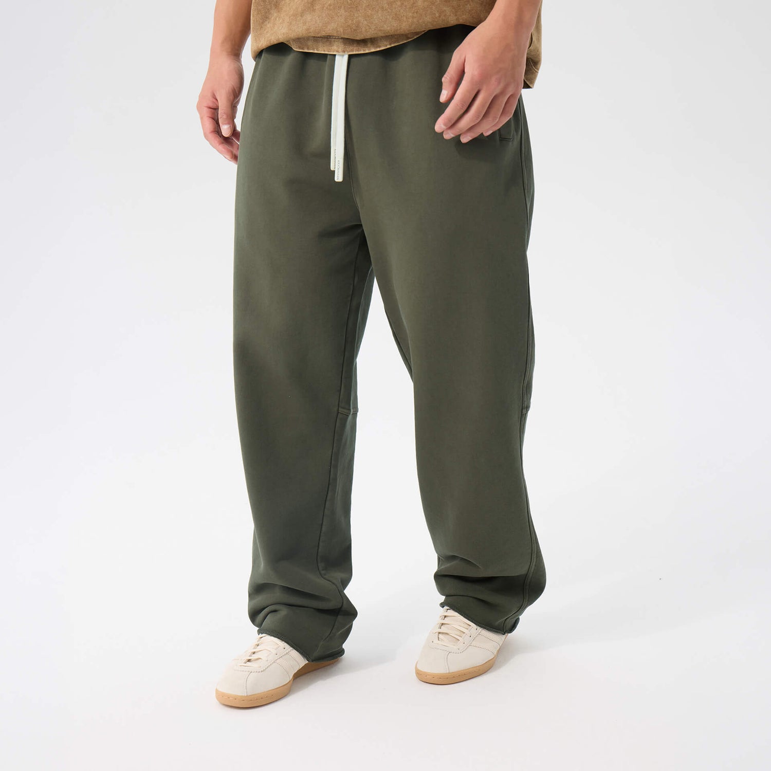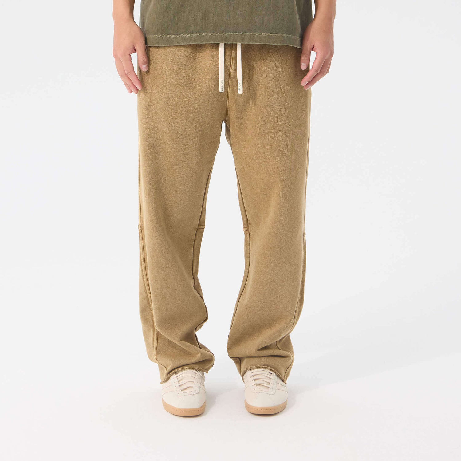 Heavyweight washed cotton. Loose through the body, mid-rise, extra long. Raw edge hems, adjustable drawstring waist. The kind of drape that looks intentional without trying.