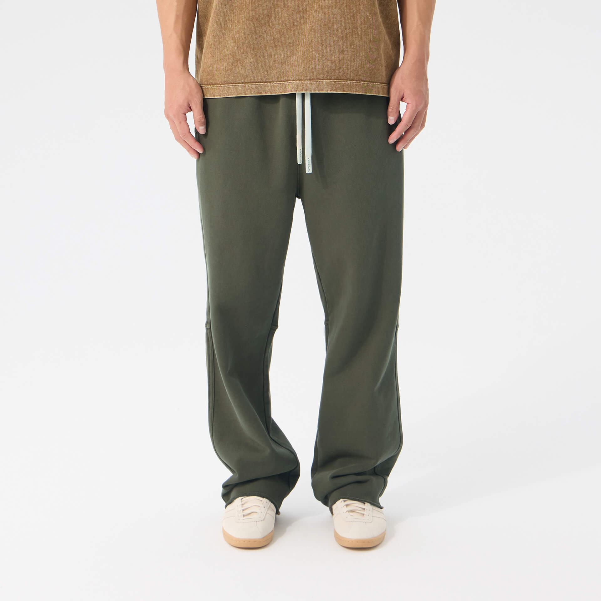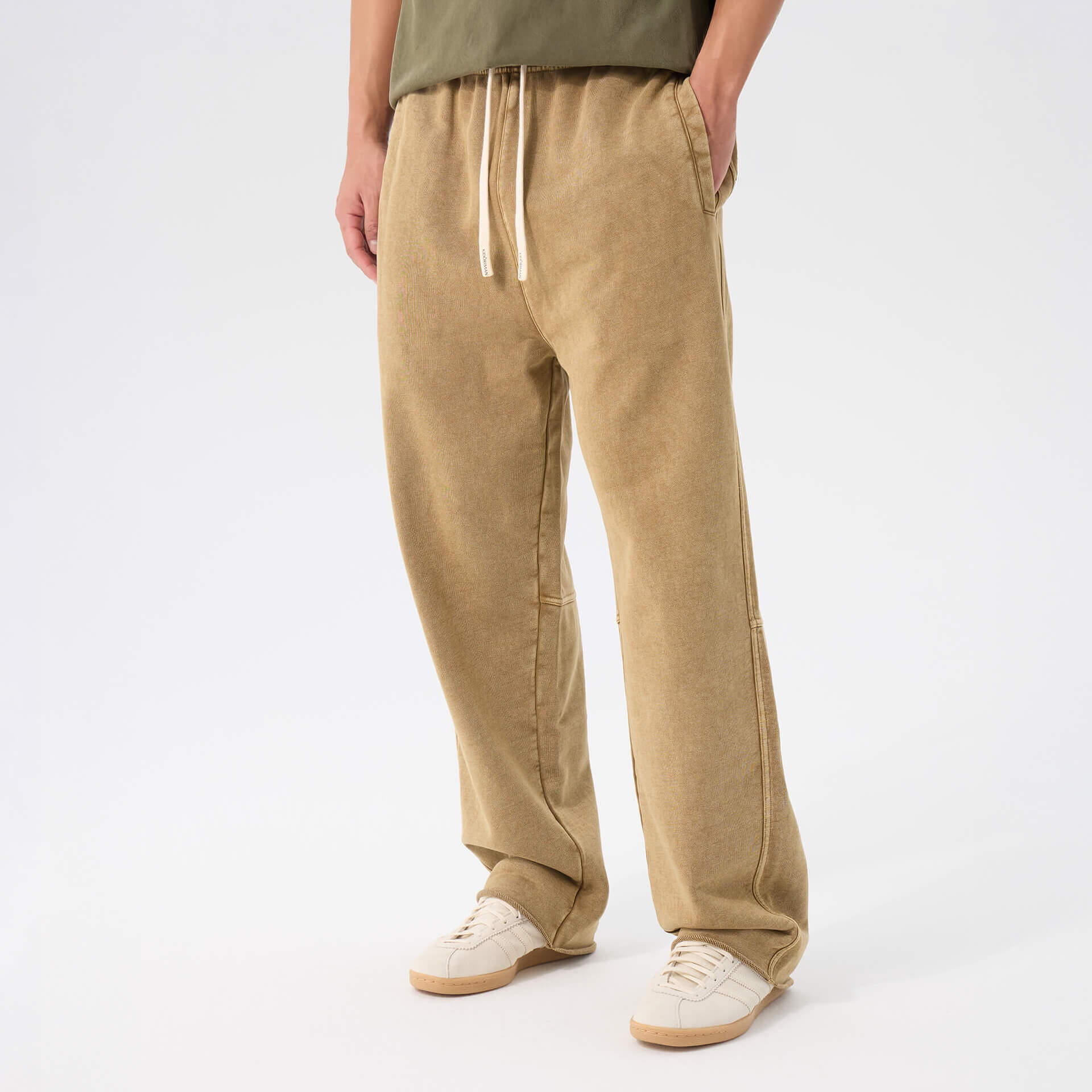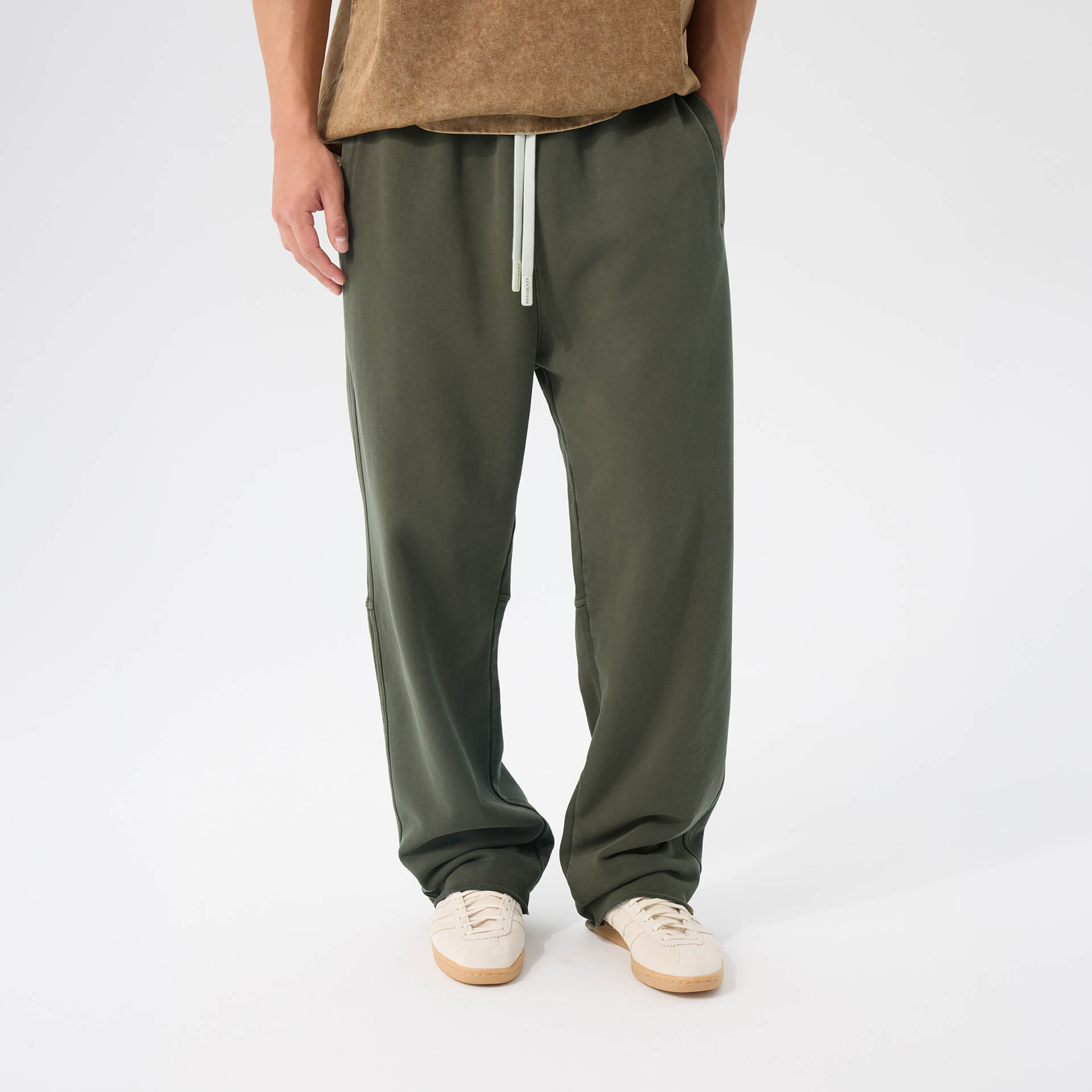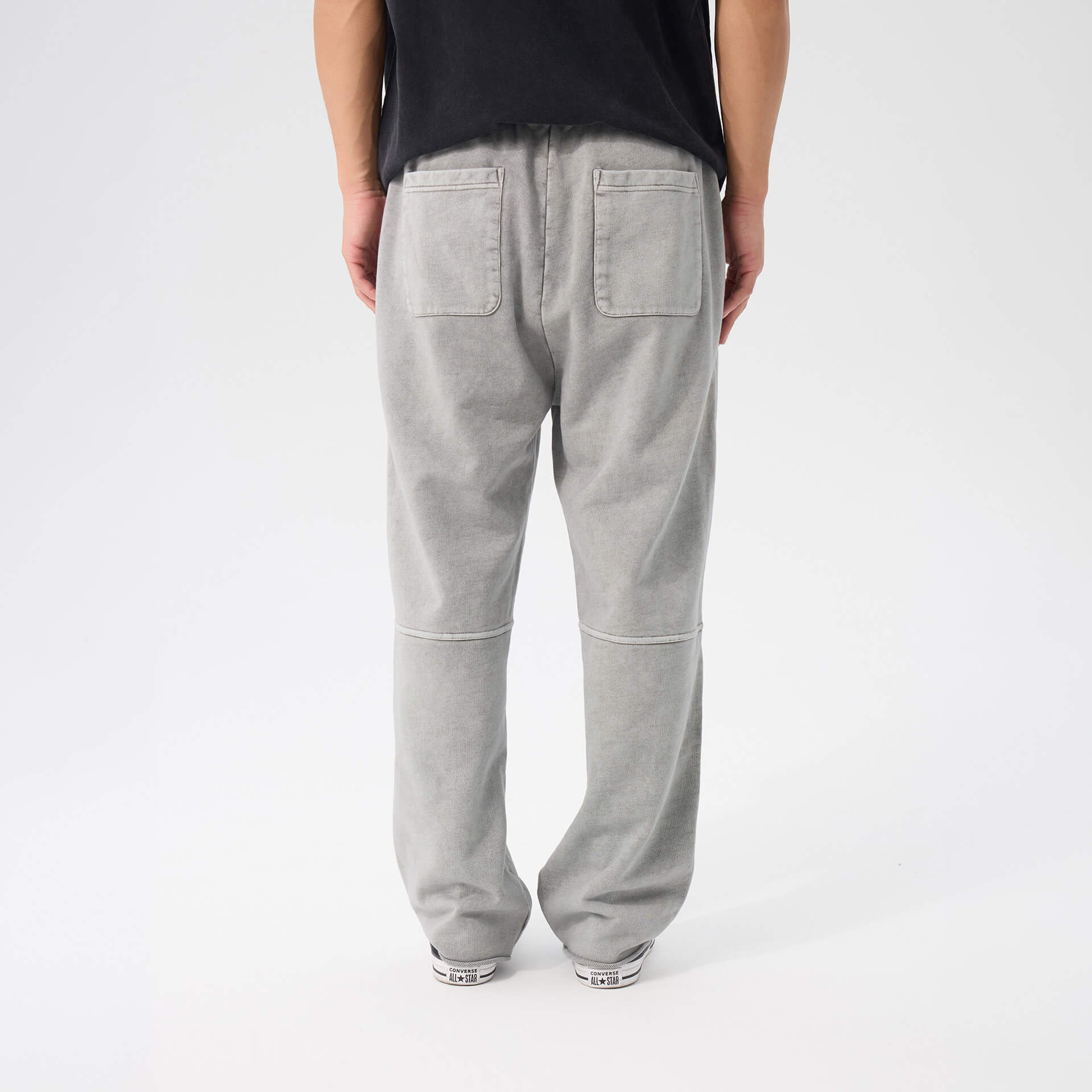 Heavyweight washed cotton. Loose through the body, mid-rise, extra long. Raw edge hems, adjustable drawstring waist. The kind of drape that looks intentional without trying.