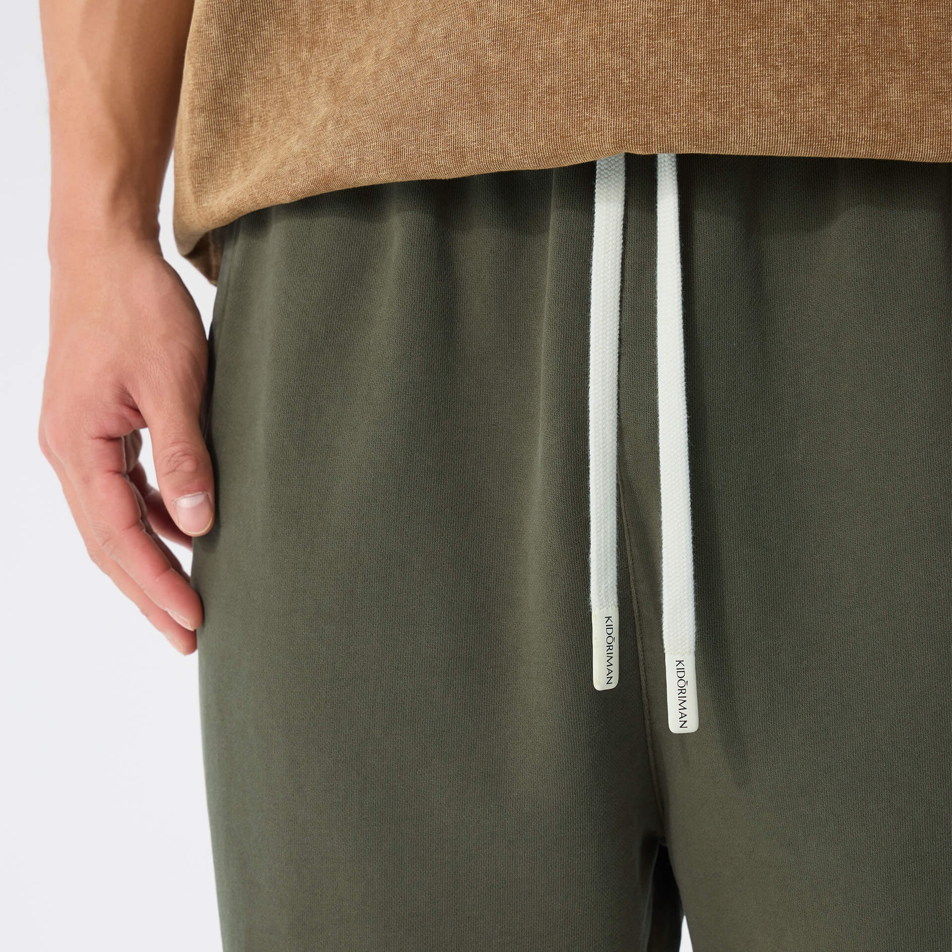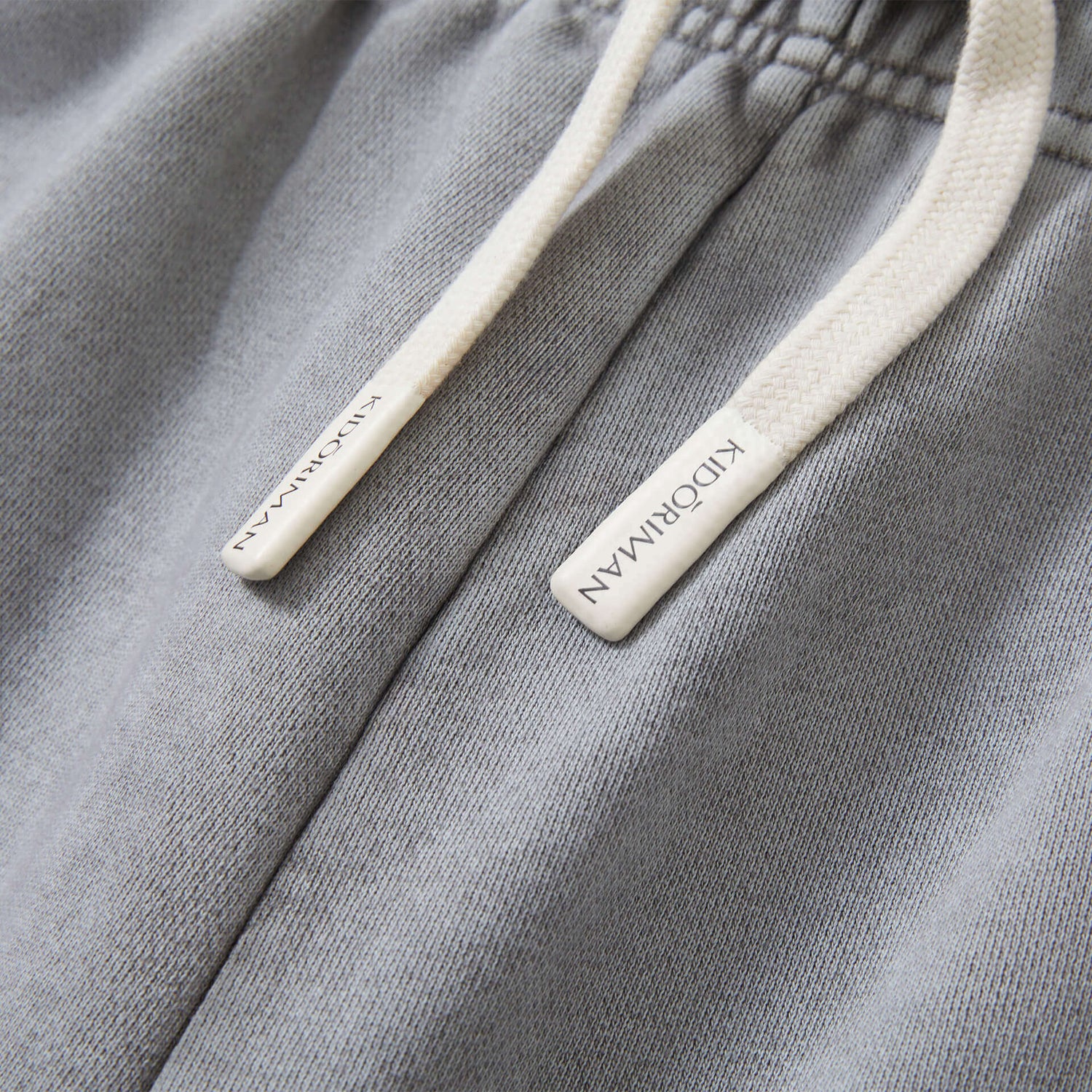 Details: Raw edge hems, adjustable drawstring waist